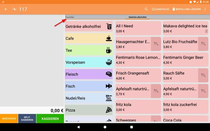 VII. Um den Artikel unter den Favoriten zu finden, wische in der Artikelauswahl einmal nach rechts oder tippe direkt auf "Favoriten".