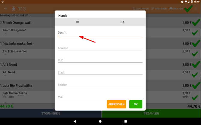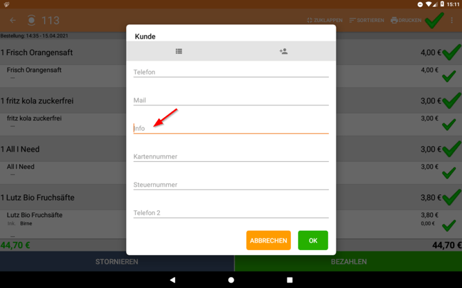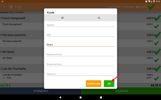I. Tippe während des Bezahlvorgangs auf "Rechnung (Kunde)" und danach auf "OK".
