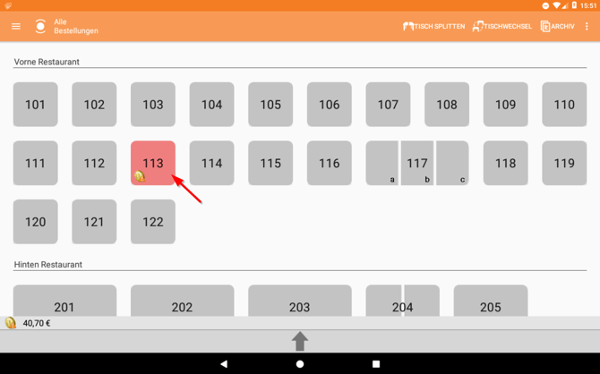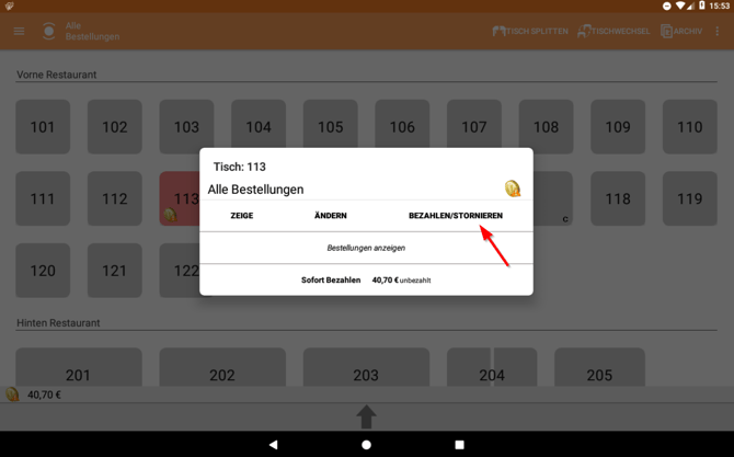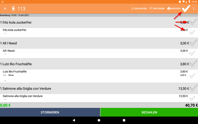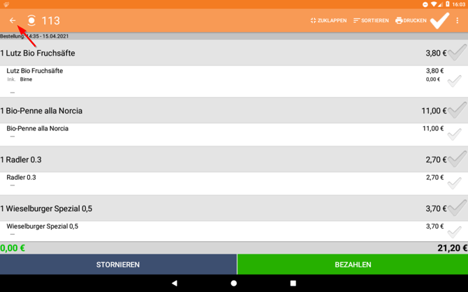 VI. Wenn du den gesamten Tisch storniert hast, gelangst du automatisch auf die Bonieroberfläche zurück. Wenn du nur einzelne Artikel storniert hast, tippe auf den Pfeil links oben, um zur Tischansicht zurückzukehren.