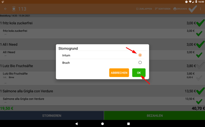 V. Wähle den Stornogrund und tippe anschließend auf "OK".