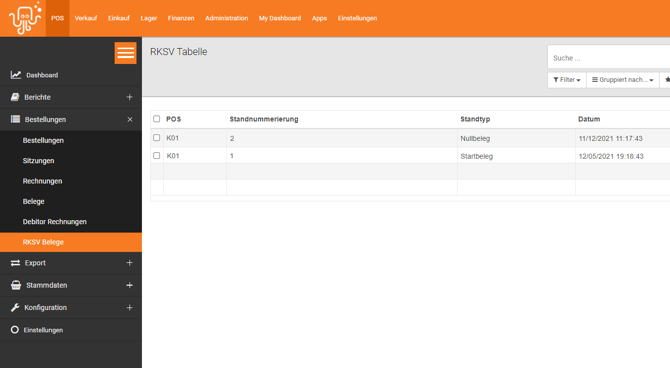 VI. Wechsel zu deiner Cloud. Klicke dort auf den Menüpunkt "Bestellungen" und anschließend auf "RKSV Belege". Wähle den soeben auf der Kassa erstellten Nullbeleg aus, indem du darauf klickst.