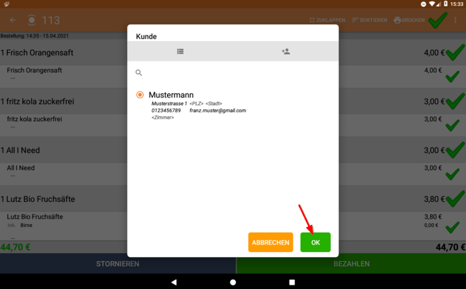 I. Tippe während des Bezahlvorgangs auf "Rechnung (Kunde)" und danach auf "OK".