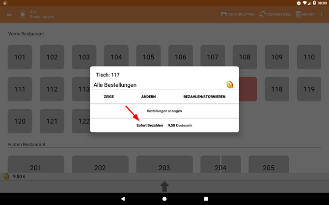 Sieh hier, wie du einen offenen Tisch sofort gesamt abrechnen kannst.